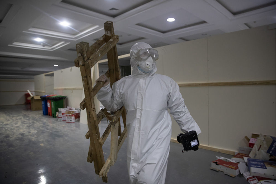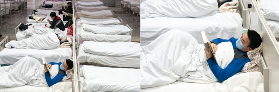 這些身影中還有被隔離的病人。江漢方艙醫(yī)院?jiǎn)⒂玫牡谝惶欤罩蔚氖着∪死铮幸粋€(gè)面目清秀的小伙子。入院躺下后,他打開(kāi)了一本《政治秩序的起源》,安靜地閱讀。口罩遮住了他的表情,但卻藏不住眼神里的平靜和專(zhuān)注。看見(jiàn)我舉起相機(jī),他輕輕擺了擺手,示意不用拍他,我猶豫片刻,還是執(zhí)意按下了快門(mén)。也許他并不明白,在有些喧囂的方艙醫(yī)院里,近乎靜止的他,是多么的令人震撼。