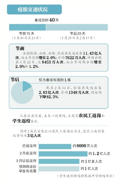 從客流類型看,未來(lái)一段時(shí)間,主要是農(nóng)民工返崗客流和學(xué)生返校客流,公務(wù)商務(wù)客流較少、旅游客流很少。預(yù)計(jì)2月底前客流以農(nóng)民工返崗流為主,2月底前將迎來(lái)學(xué)生返??土?。
