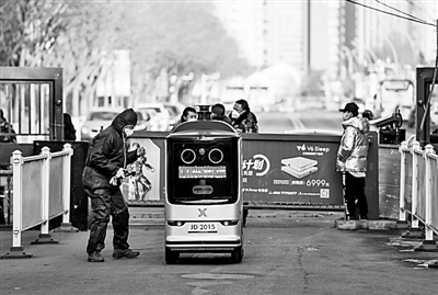2月7日,京東物流的智能配送機器人進入呼和浩特市的一個封閉管理小區,為居民配送快遞。新華社發