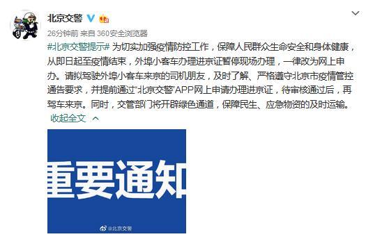 據(jù)北京市公安局公安交通管理局微博消息,為切實(shí)加強(qiáng)疫情防控工作,保障人民群眾生命安全和身體健康,從2月17日起至疫情結(jié)束,外埠小客車(chē)辦理進(jìn)京證暫停現(xiàn)場(chǎng)辦理,一律改為網(wǎng)上申辦。