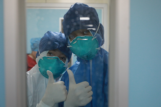 軍隊支援湖北醫(yī)療隊兩名90后護士在進“紅區(qū)”前為自己加油。陳晨/攝