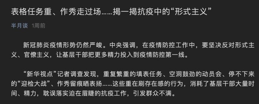 半月談記者在中東部省份調研發現,許多地方明明視頻會議系統已經建成,在此非常時期仍要求基層有大事必須進辦公室開會;大數據已經有了相當的積累,卻“秘而不宣”“藏而不露”,仍要求基層手工填表留痕。