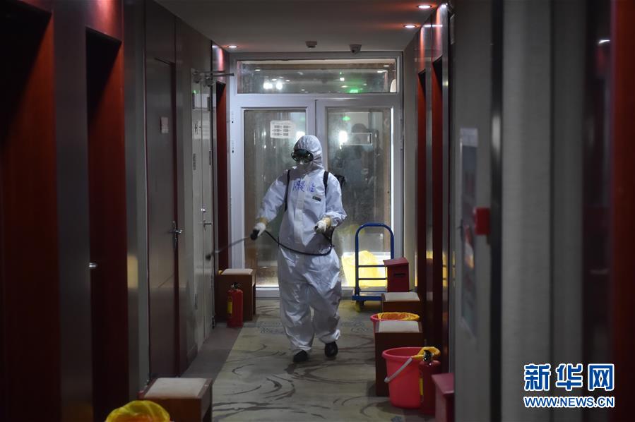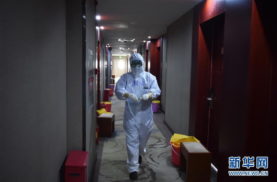 2月21日,集中觀察點護士陳曼怡對留觀人員房間走廊消毒。新華社發(陳鐘昊 攝)