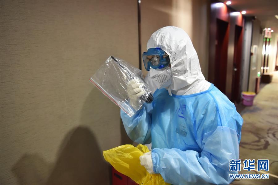 2月21日,集中觀察點護士陳曼怡準備對留觀人員進行隨訪。新華社發(陳鐘昊 攝)