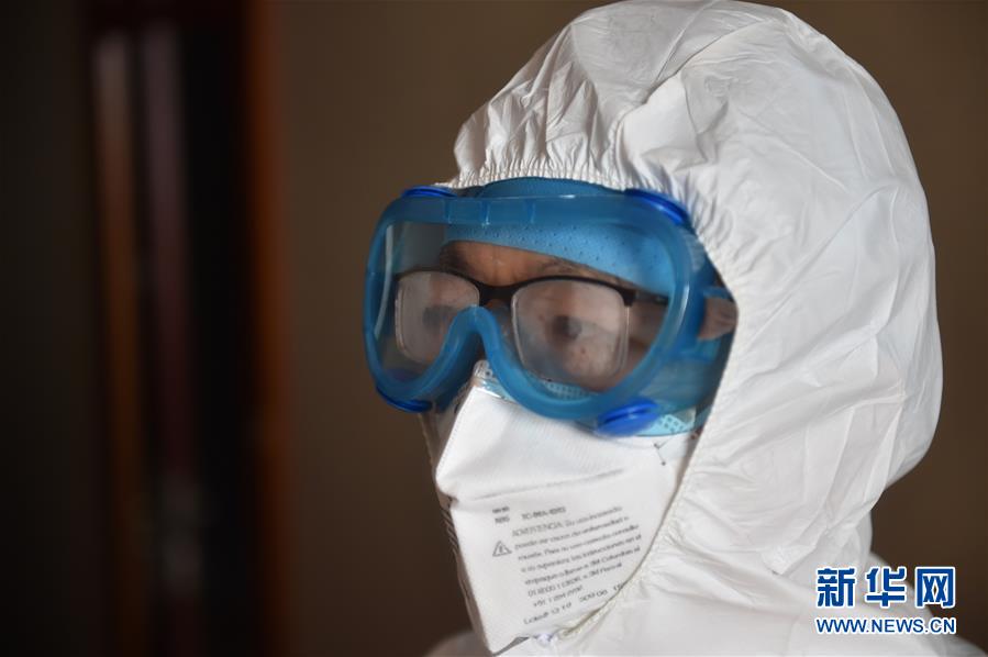 2月21日,集中觀察點護士陳曼怡在對留觀人員進行隨訪前佩戴口罩。新華社發(陳鐘昊 攝)