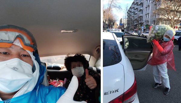 圖為滴滴司機程科意接出院的社區居民回家(圖左)程科意幫助搬運蔬菜(圖右)