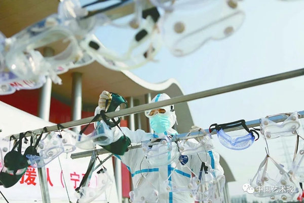 2月22日,武漢市武漢客廳方艙醫院外,援鄂醫療隊工作人員清潔護目鏡。 中國攝協赴湖北抗擊疫情攝影小分隊?李舸 攝