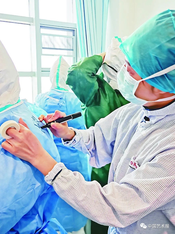 2月22日,武漢華中科技大學同濟醫學院附屬同濟醫院中法新城院區,北京醫院國家醫療隊負責的病區。醫護人員在防護服上寫下姓名,整裝待發。中國攝協赴湖北抗擊疫情攝影小分隊 陳黎明 攝