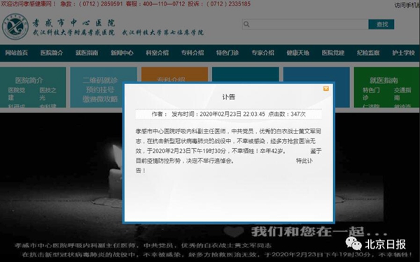昨晚,湖北孝感市中心醫院官網發布訃告: