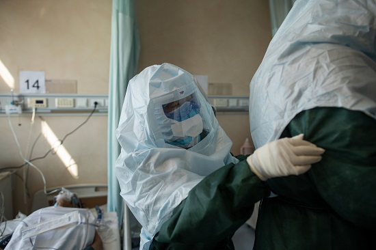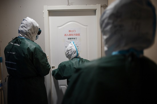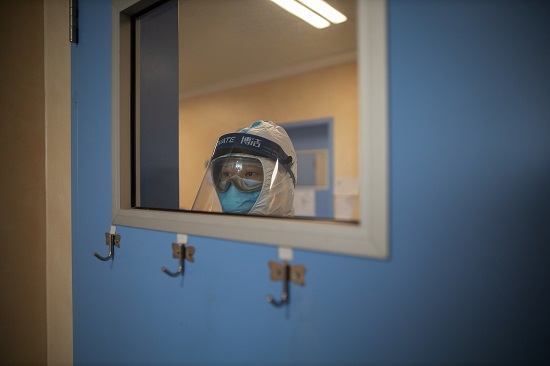 結(jié)束任務(wù)的隊(duì)員在等候著脫掉防護(hù)服,走出4個(gè)隔離區(qū),才可稍微放松一些。