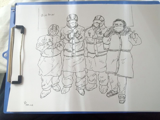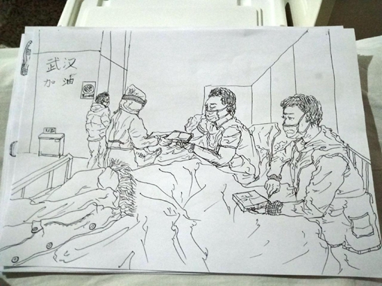 他把畫的“方艙生活”發到了微博上——兩位病人在床,護士俯身照顧。畫中醫院的墻上被他特意寫了四個字:“武漢加油。”(程盟超)