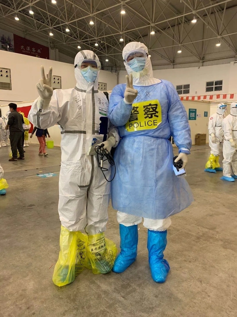 武漢廣播電視臺新聞頻道深度資訊部記者李永杰(左)在武漢客廳方艙醫(yī)院病區(qū)內(nèi)偶遇東西湖區(qū)交通大隊(duì)漢警快騎隊(duì)民警張敬畏。