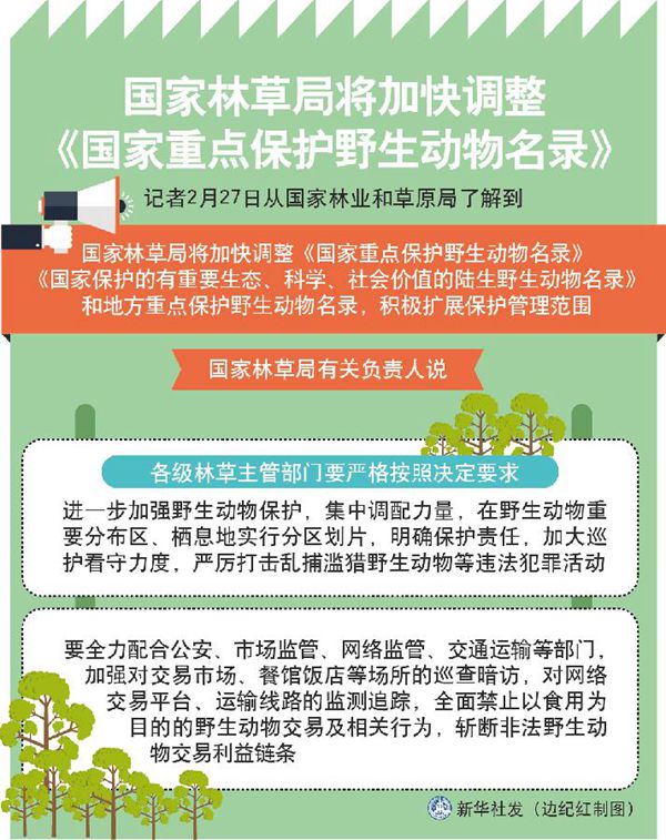 新華社北京2月27日電(記者胡璐)記者27日從國家林業(yè)和草原局了解到,國家林草局將加快調(diào)整《國家重點(diǎn)保護(hù)野生動(dòng)物名錄》《國家保護(hù)的有重要生態(tài)、科學(xué)、社會(huì)價(jià)值的陸生野生動(dòng)物名錄》和地方重點(diǎn)保護(hù)野生動(dòng)物名錄,積極擴(kuò)展保護(hù)管理范圍。