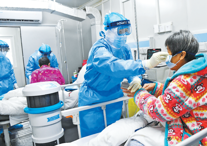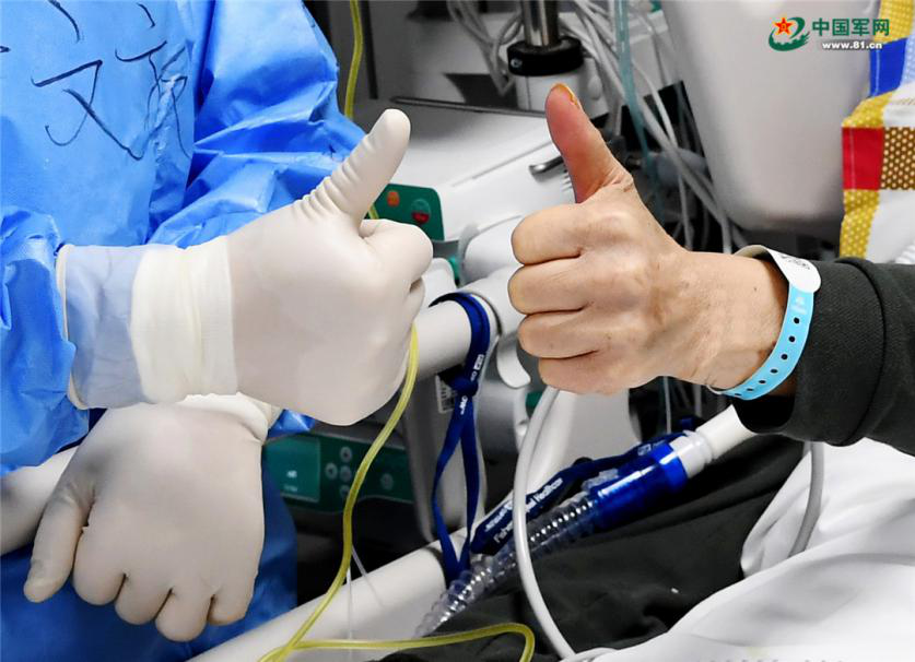 火神山醫(yī)院重癥醫(yī)學(xué)一科自2月10日開始收治重癥患者以來,全科醫(yī)護人員不畏風(fēng)險全力救治,他們根據(jù)患者病情的變化,有預(yù)見性地快速調(diào)整救治方案,采取呼吸支持、抗病毒、維護臟器功能、加強營養(yǎng)等方法,使重癥患者逐漸有了好轉(zhuǎn),提高了救治成功率。互相鼓勵點贊,是在重癥室看到最多的場景。解放軍報記者王傳順 攝