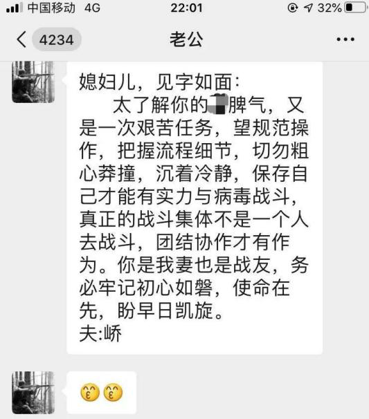 軍隊支援湖北醫(yī)療隊隊員彭渝瞞著家人馳援武漢,丈夫直到看見別人發(fā)的照片,才知道她已經(jīng)出發(fā)。兩人在電話里大吵一架,冷靜之后,同為軍人的丈夫給彭渝發(fā)了一條微信“你是我妻也是戰(zhàn)友,盼凱旋!”看到微信,彭渝落淚……