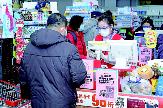 春節以來,超市客流量增加,物美超市北京石景山區太陽島門店收銀員葉宗萍一直在門店堅守,從春節至今沒歇一天。采訪對象供圖