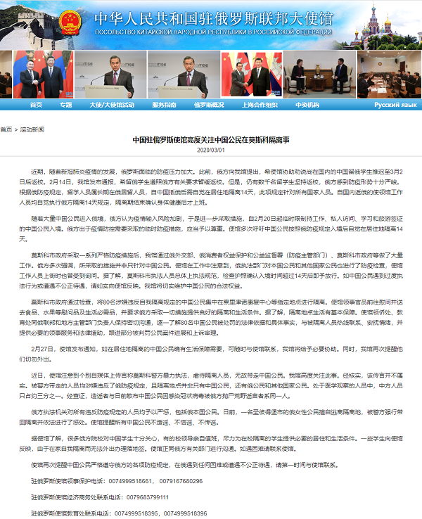 據使館了解,很多俄方院校對中國學生十分關心,有的校領導親自值班,盡力為在校隔離的學生提供必要的居住和生活條件。一些學生向使館反映,由于在家自我隔離而無法外出辦理落地簽。使館正同俄方有關部門進行溝通。如遇困難請聯系使館。