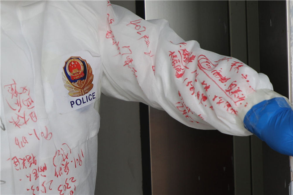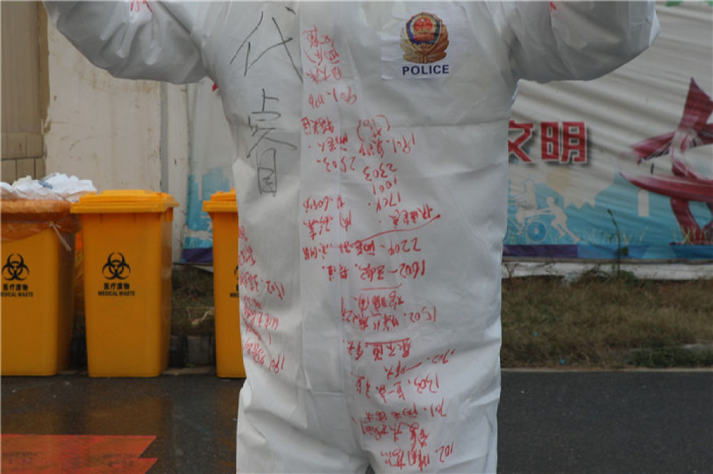 用紅色簽字筆寫在防護服上醒目的位置