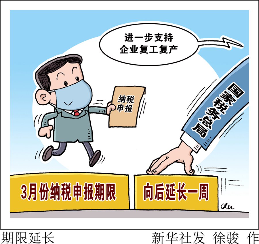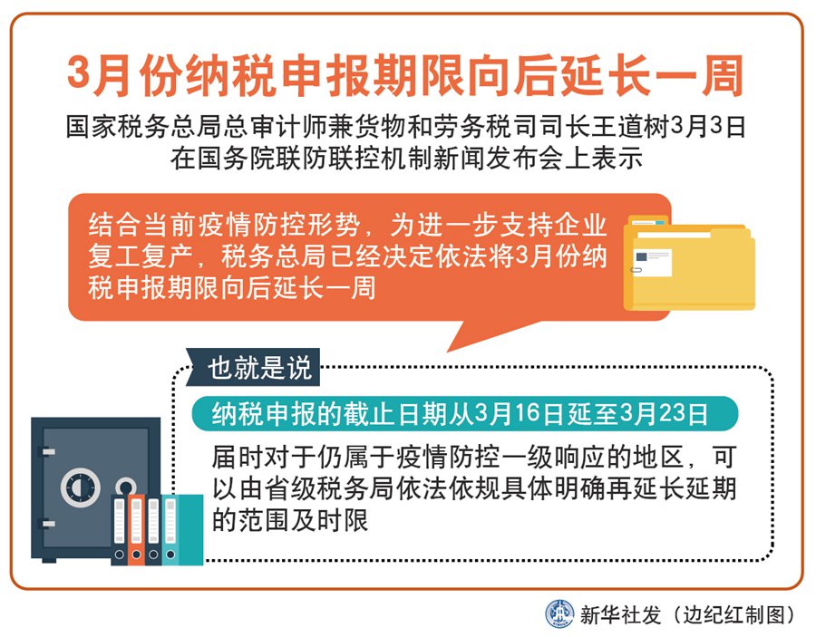 新華社北京3月3日電(記者郁瓊源 王秉陽)國家稅務總局總審計師兼貨物和勞務稅司司長王道樹3日在國務院聯防聯控機制新聞發布會上表示,結合當前疫情防控形勢,為進一步支持企業復工復產,稅務總局已經決定依法將3月份納稅申報期限向后延長一周。