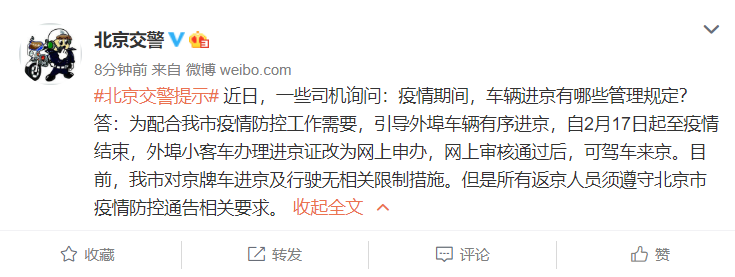 據北京市公安局公安交通管理局官方微博3月4日消息,近日,一些司機詢問:疫情期間,車輛進京有哪些管理規定?答:為配合我市疫情防控工作需要,引導外埠車輛有序進京,自2月17日起至疫情結束,外埠小客車辦理進京證改為網上申辦,網上審核通過后,可駕車來京。目前,我市對京牌車進京及行駛無相關限制措施。但是所有返京人員須遵守北京市疫情防控通告相關要求。