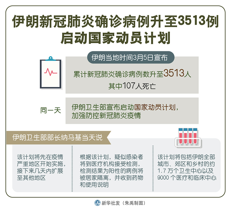 新華社德黑蘭3月5日電(記者陳霖)伊朗5日宣布累計(jì)新冠肺炎確診病例數(shù)升至3513人。同一天,伊朗衛(wèi)生部宣布啟動(dòng)國(guó)家動(dòng)員計(jì)劃,加強(qiáng)防控新冠肺炎疫情。