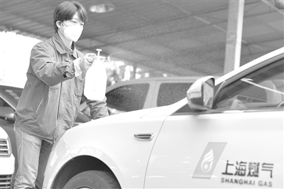 上海燃?xì)鈾z修人員對待命中的出勤車輛進(jìn)行消毒。(企業(yè)供圖)
