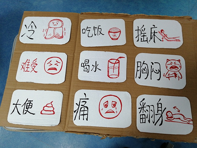 來(lái)自江西省人民醫(yī)院的護(hù)士陳鈺浠就地取材,利用廢紙板和小卡片制作“圖解護(hù)理需求表”,把患者最常用的十幾個(gè)需求變成圖標(biāo),解決了重癥患者不方便言語(yǔ)和醫(yī)護(hù)人員聽(tīng)不懂方言的困難。