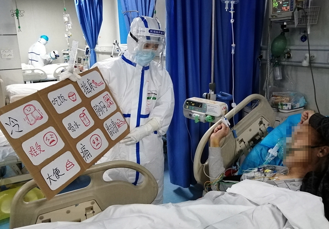 在武漢市第五醫(yī)院重癥病區(qū),醫(yī)護(hù)人員每天面對(duì)的都是重癥病人,他們普遍病情嚴(yán)重,要靠氣管插管維持,幾乎不能說(shuō)話(huà)。偶爾有能說(shuō)話(huà)的病人,方言又重。