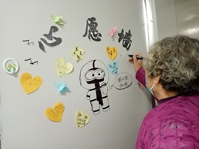 患者在手繪心愿墻上畫(huà)海鷗寫(xiě)心愿。