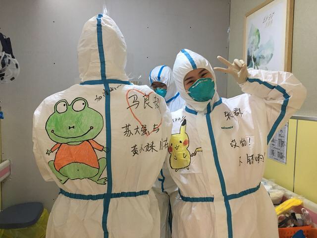 在武漢兒童醫(yī)院新冠肺炎患兒隔離病房里,平時(shí)喜歡畫(huà)畫(huà)的護(hù)士王佳想到一個(gè)妙招——在防護(hù)服上畫(huà)卡通畫(huà),再讓小朋友涂色,幫助他們減輕恐懼。