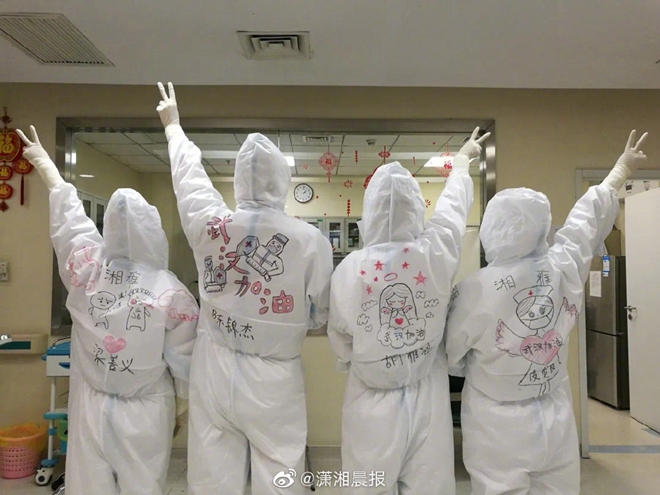 隊(duì)友們展示防護(hù)服上吳思容的畫(huà)作,擺出勝利的手勢(shì)。