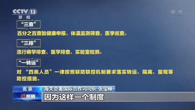 海關(guān)總署國際合作司司長 張寶峰:“三查”“三排”“一轉(zhuǎn)運(yùn)”是我們海關(guān)多年來摸索探索形成的一個(gè)比較成熟的、規(guī)范的應(yīng)對重大國外疫情傳入的制度模式。運(yùn)行這個(gè)模式,主要有三個(gè)方面,第一就是海關(guān)的執(zhí)行,海關(guān)在執(zhí)行方面我們是非常有信心的。