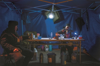 3月12日凌晨,堅守在草廠三條北口的保安張俊生(圖右)和張志桓。他們的夜宵是每人一碗方便面加一個饅頭。