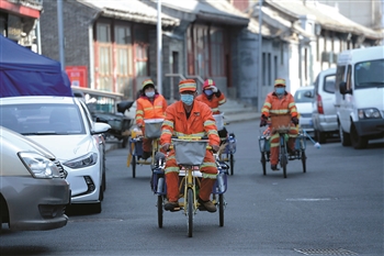 3月11日,前門街道,環衛工們走街串巷打掃衛生。