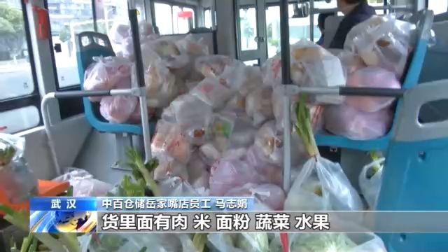 中百倉儲岳家嘴店員工 馬志娟:這一車貨我們是送到岳家嘴小區的,貨里面有肉,米,面粉,蔬菜,水果,包括大家覺得非常時期武漢時期吃不到的熱干面。黃瓜、萵苣、筍瓜、新鮮的大白菜、還有土豆,這一袋子五十塊錢。