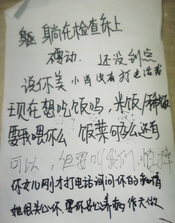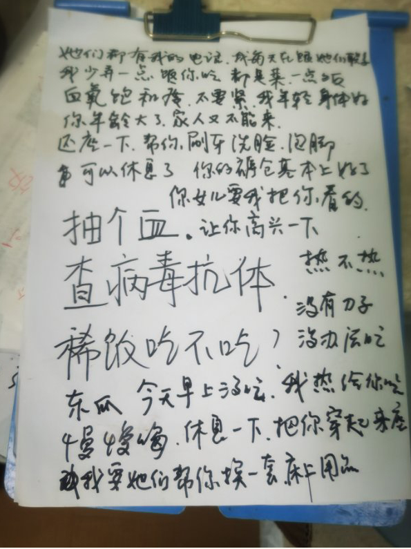 家人打來電話時,她聽不清家人的話,我的同事們就將那些話寫在紙上給她,“我把你的照片發(fā)給你的大女兒看,她很高興,也放心多了。她要你能吃就多吃,吃得多,好得快。”
