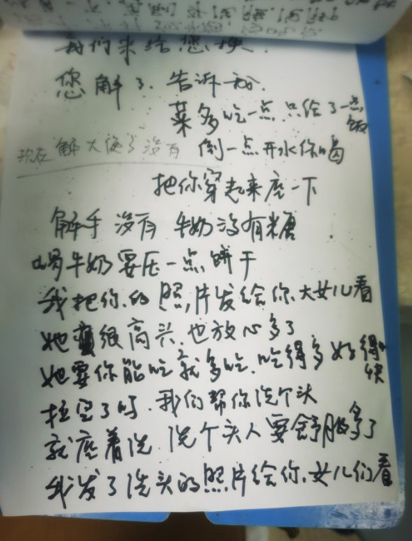 護(hù)士們在草稿紙上寫下對秦奶奶的關(guān)心