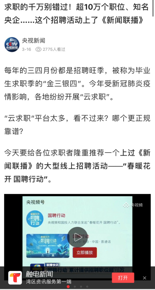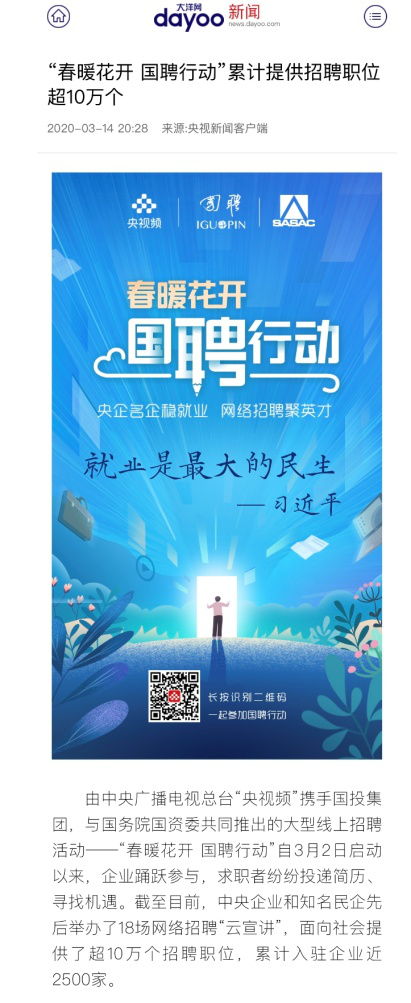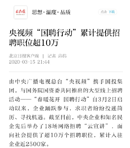 由中央廣播電視總臺“央視頻”攜手國投集團,與國務院國資委共同推出的大型線上招聘活動——“春暖花開 國聘行動”,自3月2日啟動以來,企業踴躍參與,求職者紛紛投遞簡歷。截至3月14日已面向社會提供了超10萬個招聘職位,累計入駐企業近2500家,引發眾多媒體和網站轉載報道。