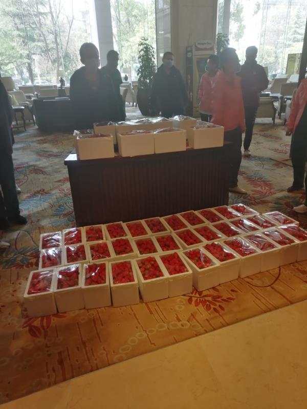 18日,河北省部分援鄂醫護人員將返回河北,獲悉這個信息后,在17日上午,武漢市江岸方艙醫院治愈的患者將百余箱新鮮草莓送到了河北醫護人員手里。