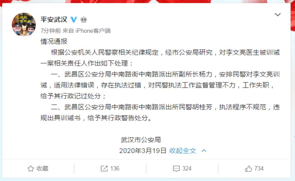 根據公安機關人民警察相關紀律規定,經市公安局研究,對李文亮醫生被訓誡一案相關責任人作出如下處理: