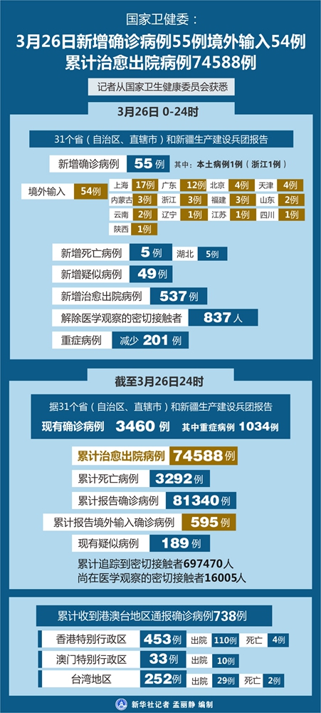 新華社北京3月27日電(記者齊中熙、張泉)記者27日從國家衛生健康委員會獲悉,3月26日0—24時,31個省(自治區、直轄市)和新疆生產建設兵團報告新增確診病例55例,其中境外輸入病例54例,本土病例1例(浙江1例);新增死亡病例5例(湖北5例);新增疑似病例49例。