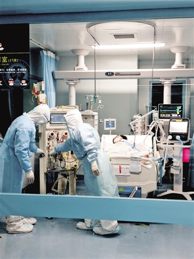 東院區(qū)重癥監(jiān)護室內(nèi),危重癥患者在接受人工肝治療。圖片由武漢大學人民醫(yī)院提供