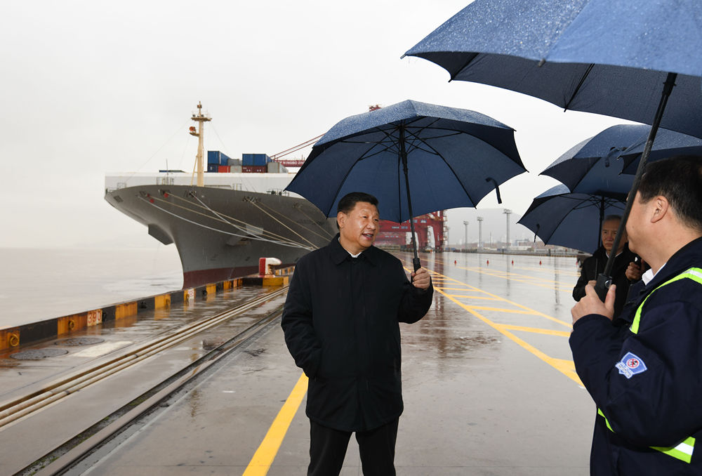 當時,總書記正在穿山港區2號集裝箱泊位察看碼頭現場作業情況。海風卷著細雨,空氣十分清新,周邊環境也很空曠,人員之間保持著比較大的距離。↓↓↓