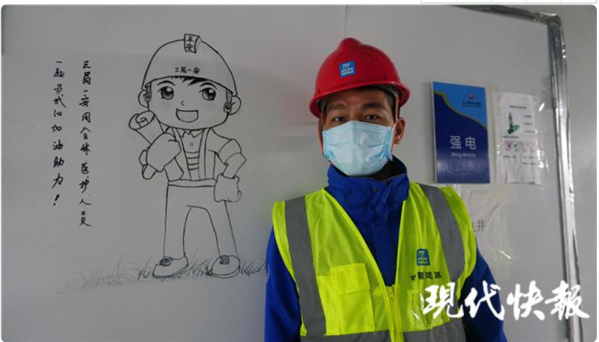 在雷神山醫(yī)院醫(yī)護(hù)人員通道里,有一組漫畫非常引人注目。這組漫畫一共9幅圖,描繪了雷神山醫(yī)院拔地而起對(duì)抗 "疫魔" 的過程,這組漫畫正是出自維保隊(duì)水電工許新焰之手。