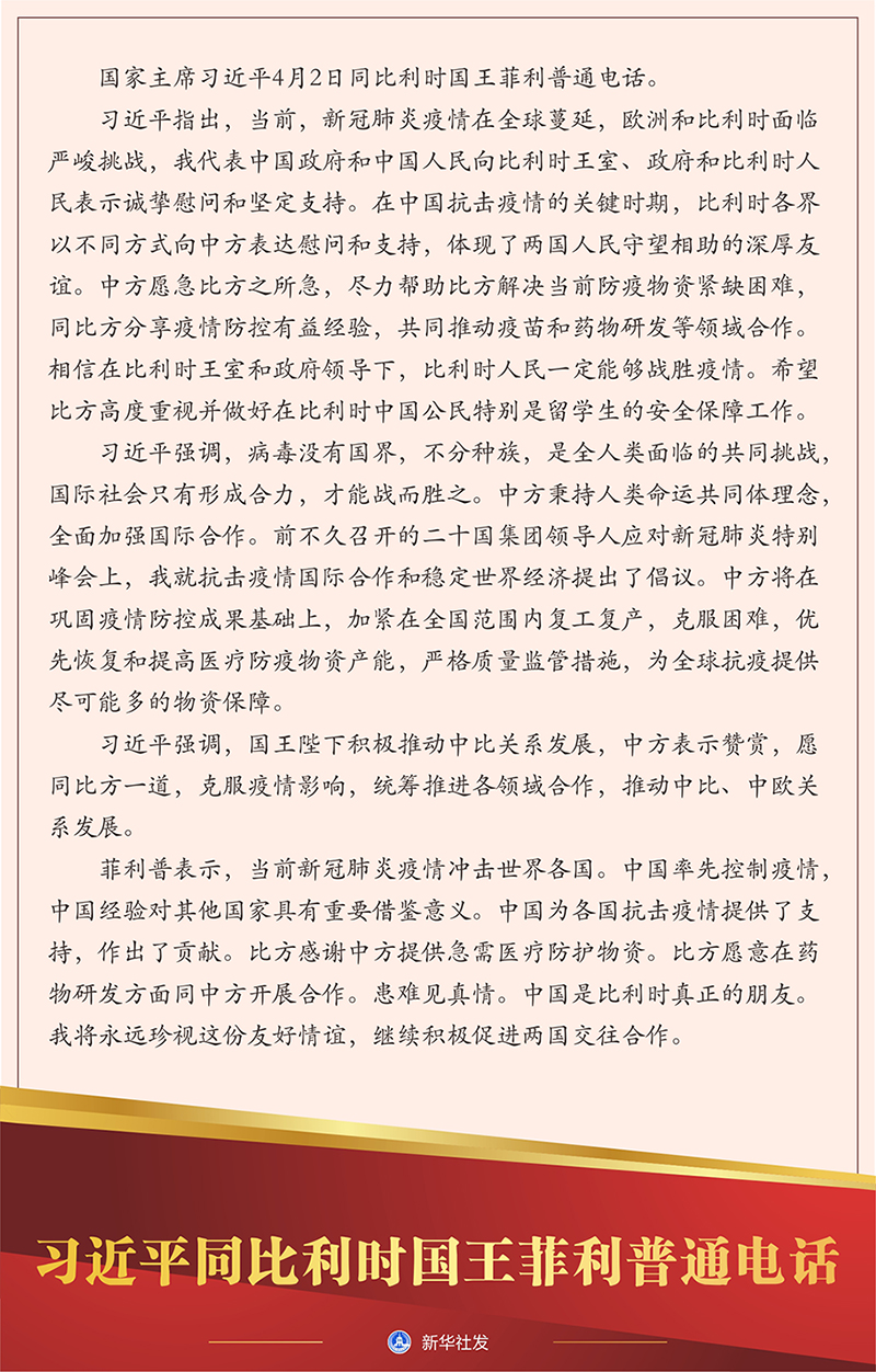 習近平指出,當前,新冠肺炎疫情在全球蔓延,歐洲和比利時面臨嚴峻挑戰,我代表中國政府和中國人民向比利時王室、政府和比利時人民表示誠摯慰問和堅定支持。在中國抗擊疫情的關鍵時期,比利時各界以不同方式向中方表達慰問和支持,體現了兩國人民守望相助的深厚友誼。中方愿急比方之所急,盡力幫助比方解決當前防疫物資緊缺困難,同比方分享疫情防控有益經驗,共同推動疫苗和藥物研發等領域合作。相信在比利時王室和政府領導下,比利時人民一定能夠戰勝疫情。希望比方高度重視并做好在比利時中國公民特別是留學生的安全保障工作。