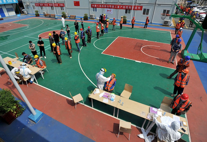 在中建八局武漢中央文化區萬達項目部,返崗員工4月7日在接受核酸和抗體指標檢測。 新華社發(史偉 攝)