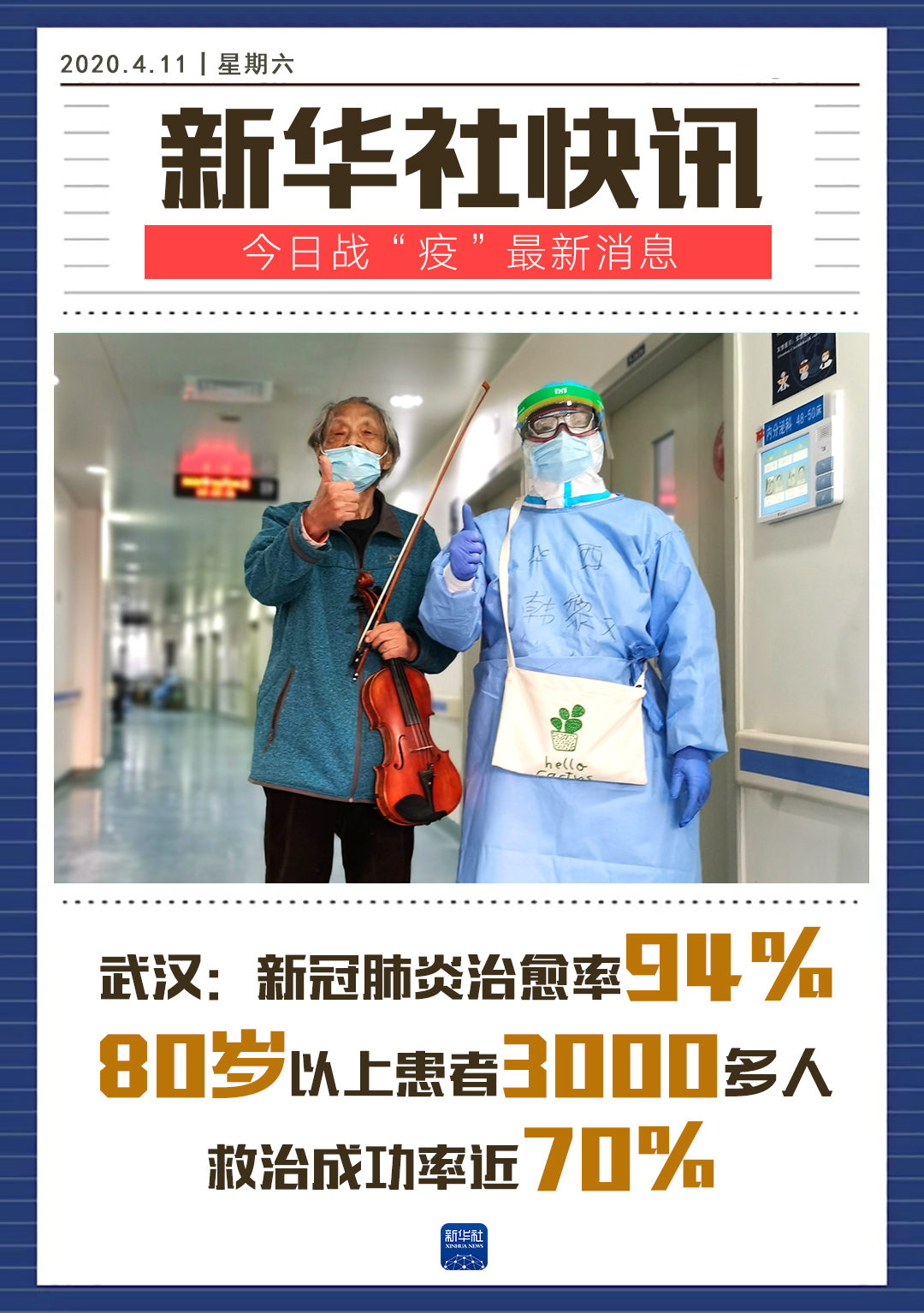 新華社武漢4月11日電(記者齊中熙、樂文婉)國家衛健委醫政醫管局監察專員焦雅輝11日說,武漢新冠肺炎患者中共有8位年齡超過100歲的患者,其中7位已經治愈出院,最大年齡108歲。