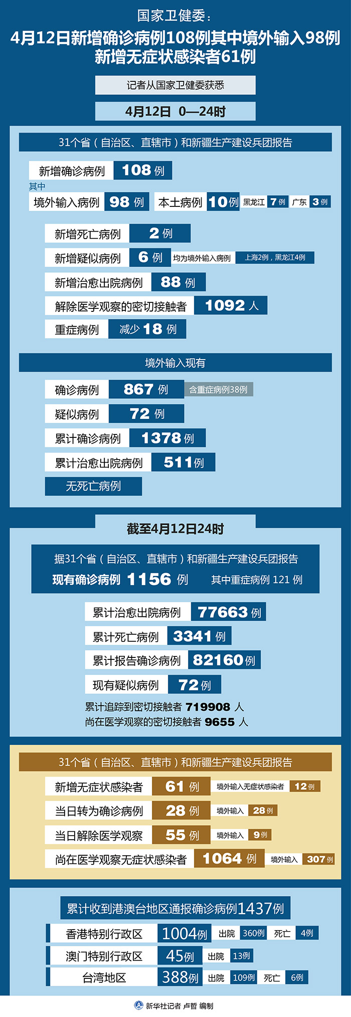 截至4月12日24時(shí),據(jù)31個(gè)省(自治區(qū)、直轄市)和新疆生產(chǎn)建設(shè)兵團(tuán)報(bào)告,現(xiàn)有確診病例1156例(其中重癥病例121例),累計(jì)治愈出院病例77663例,累計(jì)死亡病例3341例,累計(jì)報(bào)告確診病例82160例,現(xiàn)有疑似病例72例。累計(jì)追蹤到密切接觸者719908人,尚在醫(yī)學(xué)觀察的密切接觸者9655人。