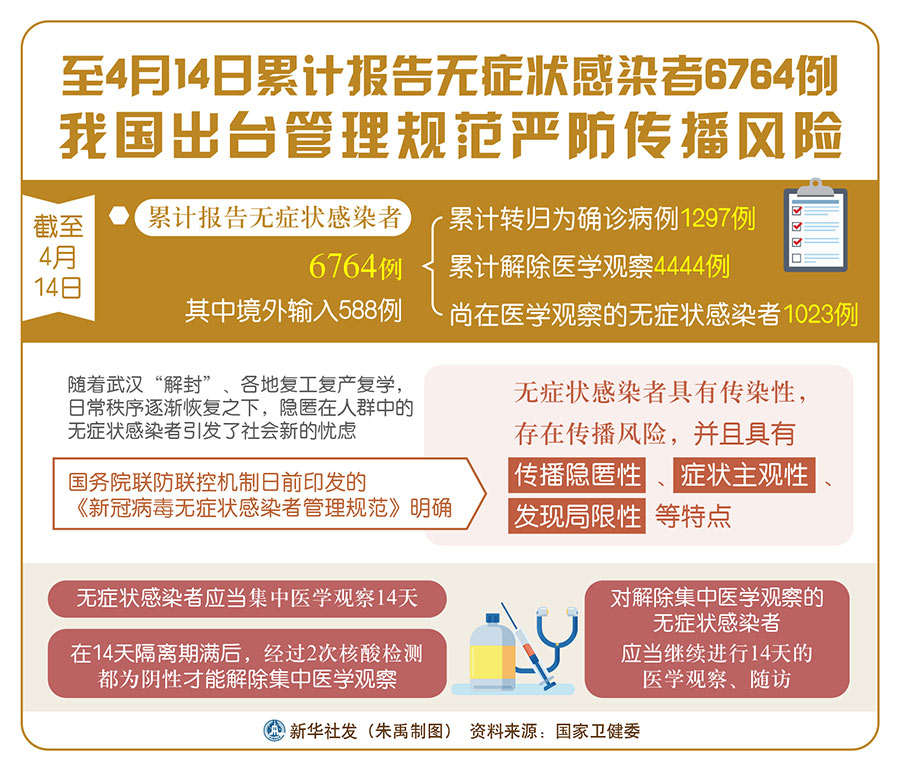 新華社北京4月15日電(記者溫競?cè)A、郁瓊源)記者從國家衛(wèi)健委獲悉,截至4月14日,累計報告無癥狀感染者6764例,其中境外輸入588例;累計轉(zhuǎn)歸為確診病例1297例,累計解除醫(yī)學(xué)觀察4444例,尚在醫(yī)學(xué)觀察的無癥狀感染者1023例。