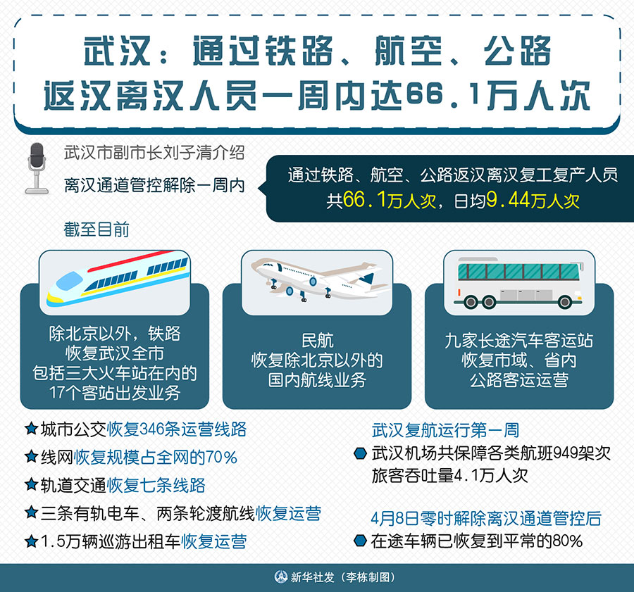 新華社武漢4月15日電(記者李偉、王作葵)武漢市副市長(zhǎng)劉子清介紹,離漢通道管控解除一周內(nèi),通過鐵路、航空、公路返漢離漢復(fù)工復(fù)產(chǎn)人員共66.1萬(wàn)人次,日均9.44萬(wàn)人次。